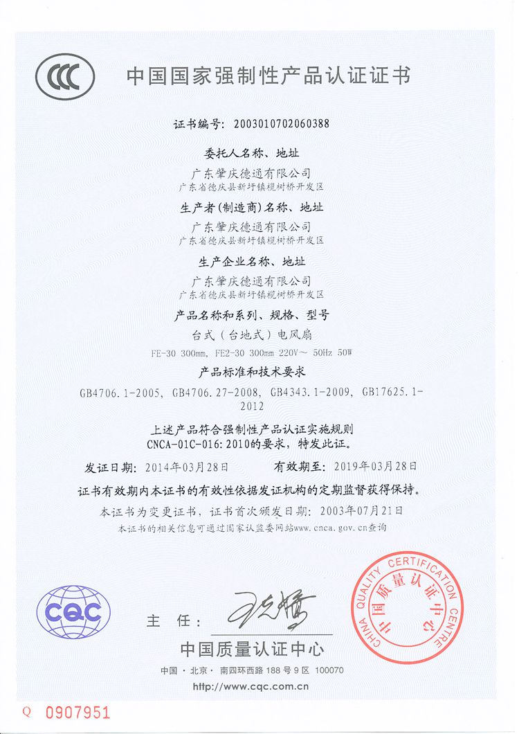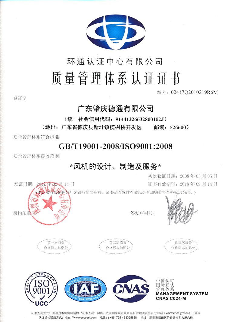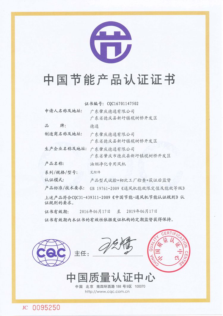德通在環保事業的大潮中毅然走在前列,環保、高效節能的風機風扇產品應運而生,多系列產品達到一級能效,獲CQC認證。