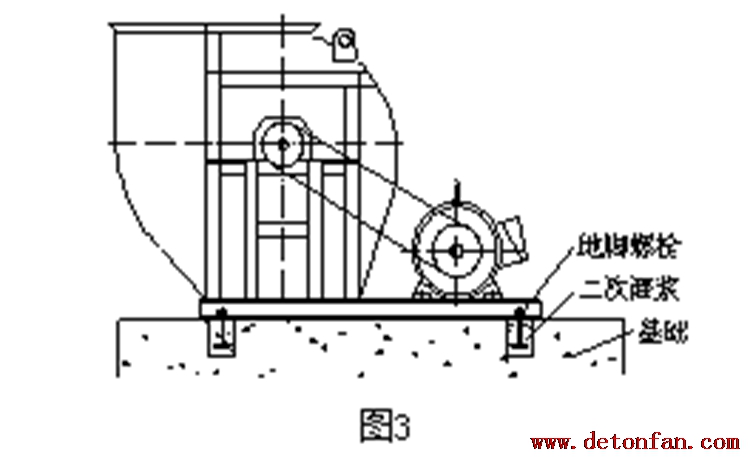 ③將風機置于基礎上,以水平儀檢查水平,可在風機底座與基礎表面之間墊上墊片來調(diào)整水平度,然后灌入水泥漿使接合面充分接觸。與此同時,在地腳螺栓預留孔內(nèi)注入水泥漿,并確保地腳螺栓垂直安置。待灰漿充分硬化后,再鎖緊螺栓。(圖3)